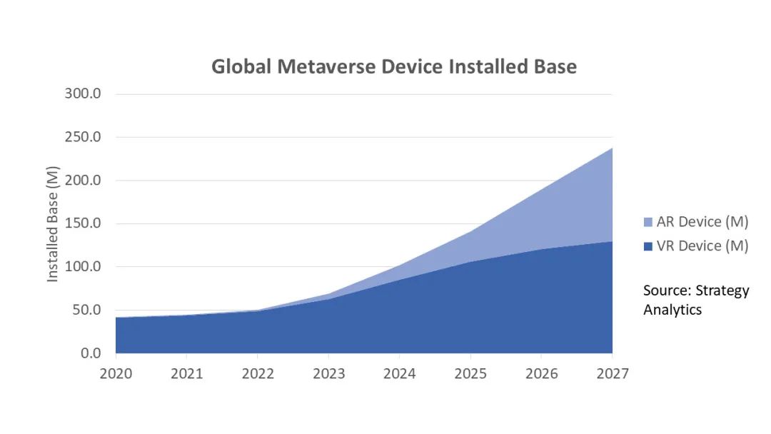 “到现在为止,商场首要是VR头显设备,AR设备首要局限于企业商场。但是,跟着更多面向顾客的设备发布,咱们估计AR头显设备将推进未来的增加。2021年,AR设备出货量仅占元世界设备的1%多一点,而到2027年,其占比将增加到64%。”