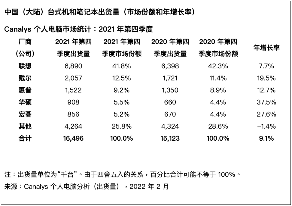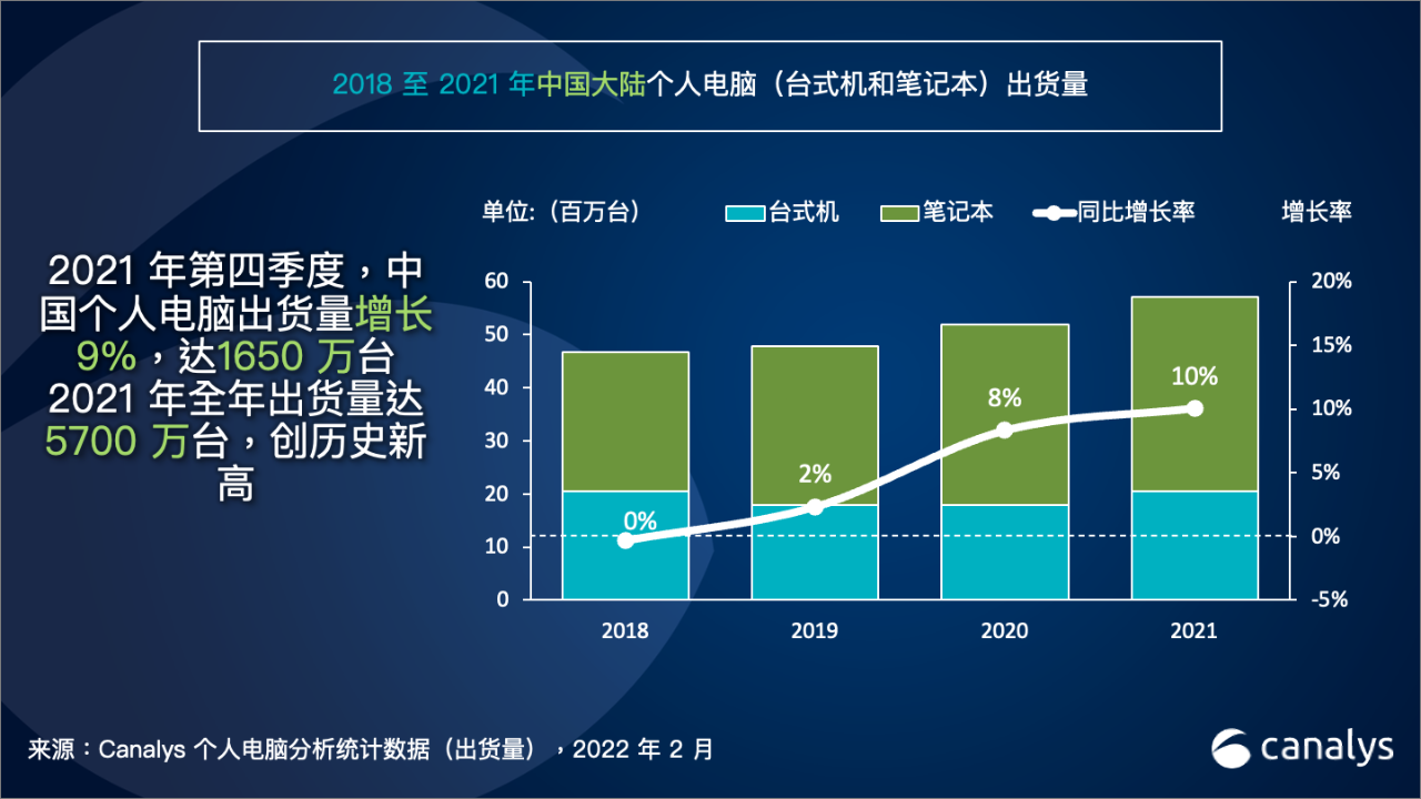 依据Canalys发布的最新数据,2021 年第四季度,我国个人电脑出货量(不含平板电脑)增加 9%,到达 1650 万台。全体来看,2021年我国商场完成了微弱增加,全年出货量增加10%,到达 5700 万台。第四季度笔记本出货量同比增加 12%,到达 1080 万台,2021 年全年增加 8%,到达 3650 万台。第四季度台式机出货量也增加了2.5%,到达 560 万台,全年出货总量到达 2040 万台,比 2020 年高出 15%。